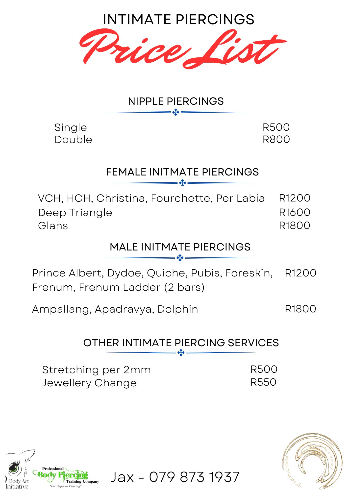 Each intimate piercing appointment includes a free consultation about the care, wearing of the intended piercing and a short discussion of alternate piercings.
